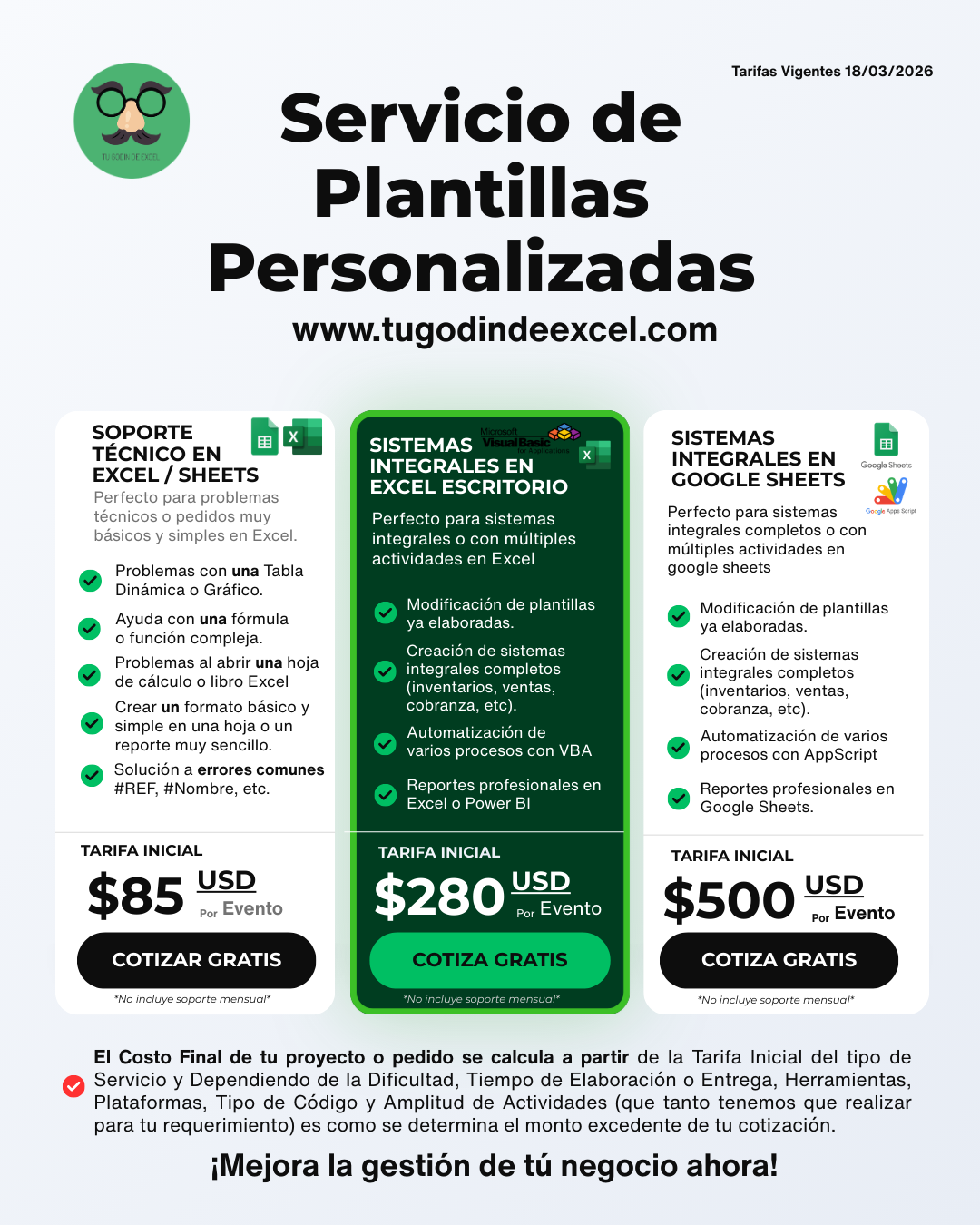 Somos un negocio de Origen Mexicano fundado desde el 2021 y brindamos nuestros servicios como Analistas Excel diseñando, desarrollando, mejorando y programando Sistemas de Administración Interna de forma personalizada y privada para todo tipo de empresas, negocios o PYMES de manera 100% Remota a Nivel Nacional e Internacional. Al mismo tiempo desarrollamos Sistemas Prediseñados en Excel o Google Sheets de diversos giros de negocios o áreas profesionales y las distribuimos a través de nuestra Tienda en Linea www.tugodindeexcel.com