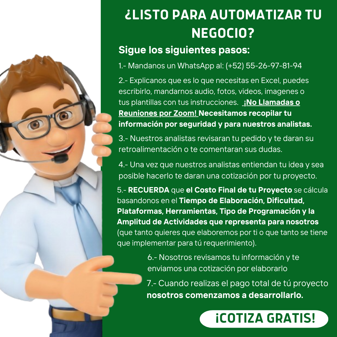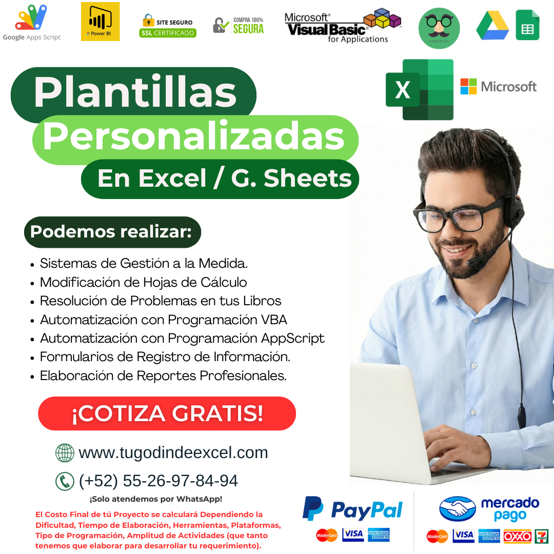 Si requieres una Plantilla Personalizada, un sistema completo en Excel o que te ayudemos a resolver o automatizar algún proceso en tu hoja de Cálculo, responde nuestro formulario y recibiras una cotización.