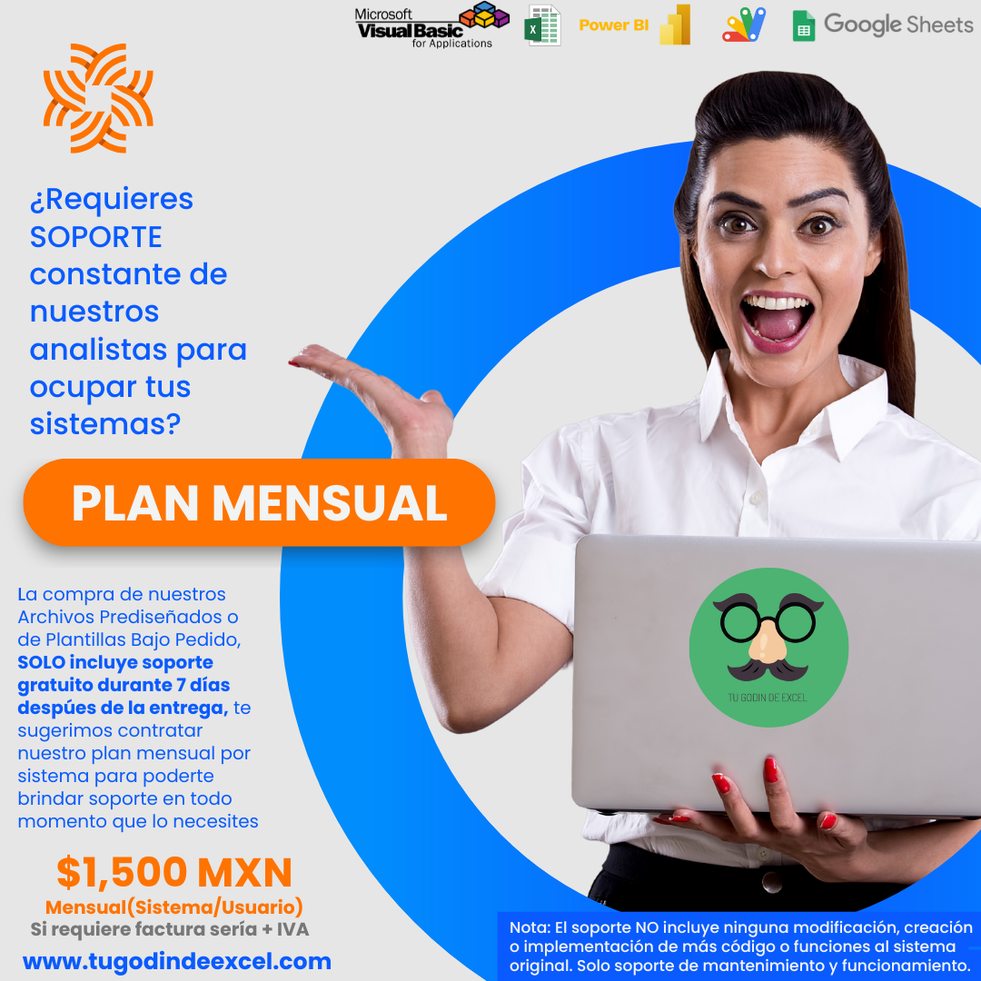 Somos una Consultoría Empresarial Especializada en Excel o Google Sheets, nuestros Servicios son 100% Digitales, si requieren mejorar su administración o la gestión de su datos podemos realizar una Plantilla Personalizada y adaptada a su negocio, nosotros atendemos a nuestros clientes por WhatsApp, Correo, Messenger o desde el chat de nuestra Tienda Oficial.