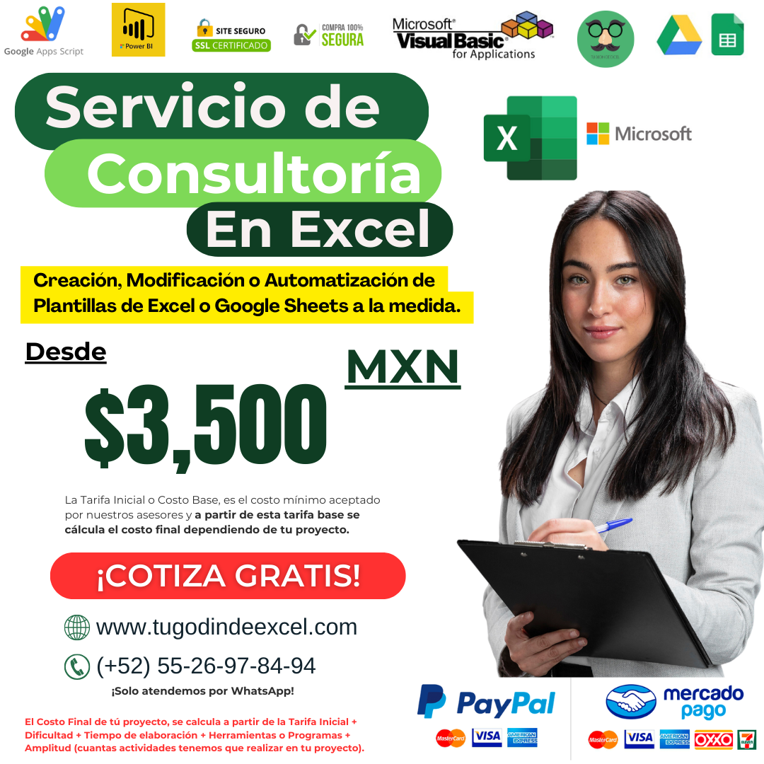 1.- Servicio de Consultoría de Excel para Pymes. Implementación de herramientas de Excel Escritorio o Google Sheets como: Formulas, Funciones, Tablas, Gráficos, Código VBA o AppScript. Precio Inicial $3,500 MXN