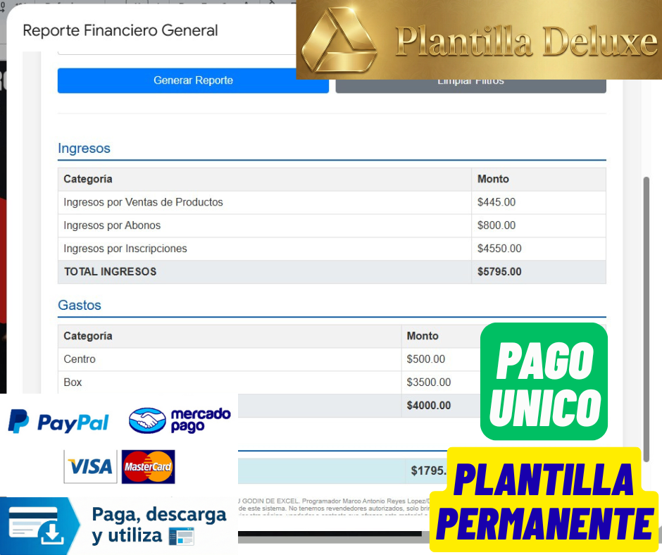 La compra de la Plantilla solo incluye 7 días gratis de Soporte Técnico una vez nosotros te enviemos el link de descarga o de acceso. Después de esos días y si quieren tener soporte por cualquier situación deberán pagar una mensualidad fija de $1,500 MXN por sistema/usuarios para que un asesor les pueda brindar el soporte por cualquier eventualidad mes con mes. (Esta mensualidad es opcional y no afecta el acceso al archivo si es que no la pagan). En dado caso de no pagar mensualidad solo se les podrá brindar soporte hasta que paguen una cuota en ese momento (que les da el beneficio de que reparemos el archivo y 30 días de soporte sobre el archivo). El pago total de esta mensualidad es por sistemas/usuarios.