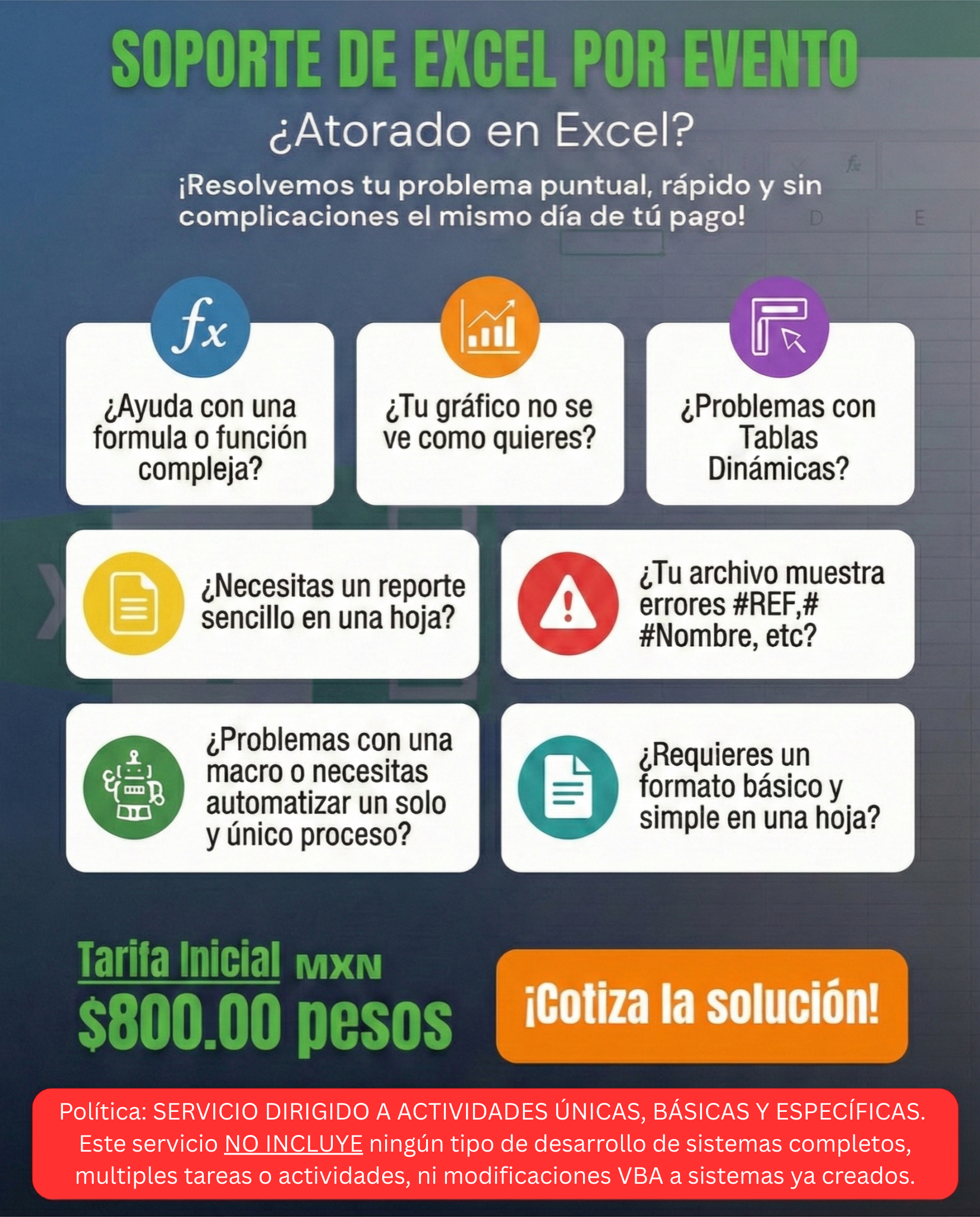 La compra de la Plantilla solo incluye 7 días gratis de Soporte Técnico por parte de nuestros Analistas y empieza a contar una vez nosotros te enviemos el link de descarga o de acceso a tu correo. Después de esos días nuestro Soporte Técnico ante cualquier situación con tu plantilla como: Correción por error humano, Dudas respecto al funcionamiento, Recuperación de Formulas o Código VBA y Ayuda con Fallos Técnicos en la operación del sistema. Tiene un costo fijo de $800 pesos MXN por Evento/Sistema/Usuario. Nota: El Soporte Técnico NO incluye modificaciones o adaptaciones al sistema original eso se cotiza bajo Nuestro Servicio de Plantillas Perosnalizadas.